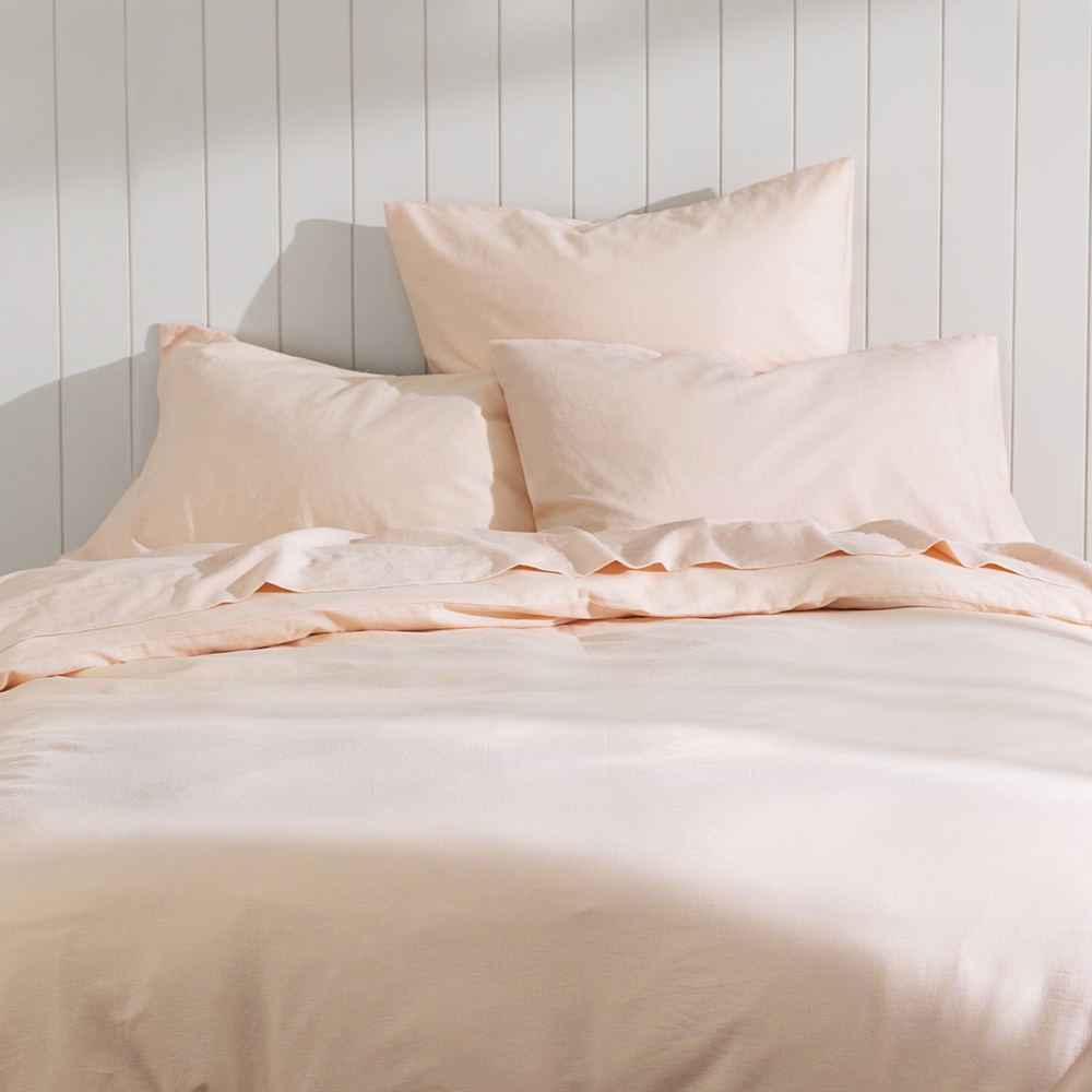 Dream provides the solid foundation to create a minimalist aesthetic or use it as your anchor pieces to accentuate high pattern quilts and pillows. This bedding collection offers a blend of European Linen and BCI Cotton in four solid colours for a classic, effortless finish. Available in a subtle Peach, this soft summer hue will tell a story on its own, or pair it with vibrant pattern bedding.