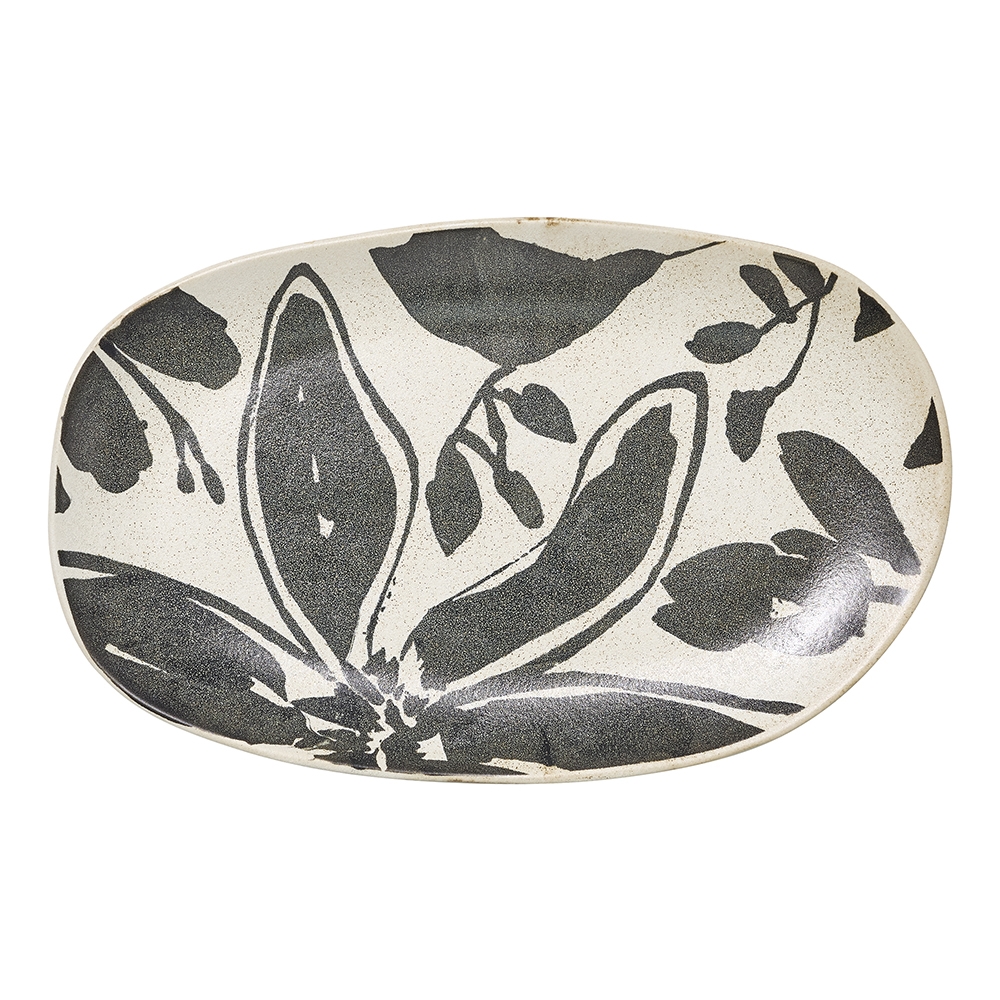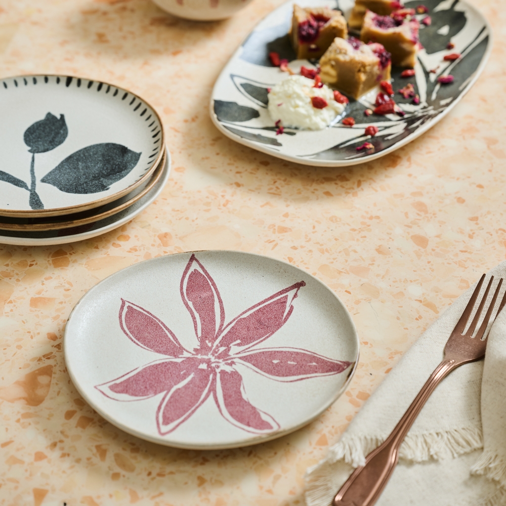 Hand-drawn floral silhouettes bloom across a rustic, beautifully imperfect base on Ecology's Cecile collection. Unrefined edges lend a well-loved charm, while earthy base tones are brought to life by delicate pin-hole detailing. Made of stoneware and designed by Noreen Falvey, Cecile showcases bold, flowing prints in deep charcoal and soft rose pink. A semi-matte glaze completes the look, enhancing the artisan character of this serveware collection.