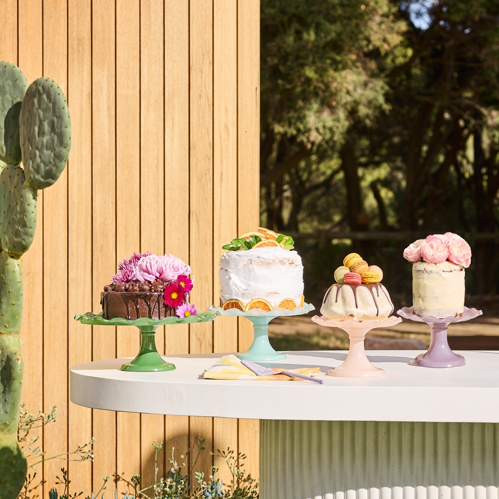 Fluted edges create a floral silhouette for Ecology’s Ruffle collection. These glass cake stands introduce four fresh summer hues with a high gloss, semi-translucent finish. A mix of sizes add colour, height and sweetness to your table.